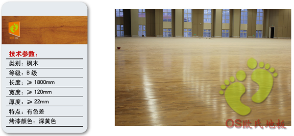 面層地板:楓木、柞木,體育運動木地板厚18mm至22mmm  寬為50mm至130mm  長度為300mm至2400mm;