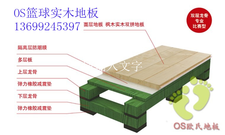 我公司體育館專用木地板采用當今**流行的全實木材料,雙層板高架通風彈性結構,因該結構在選材上全部使用了天然實木材料,可保證人們在比賽活動中,*大限度的保護了運動員的腿骨不受落地時沖擊力傷害,由于在本設計中又采用了天然橡膠制作的我廠**產品橡膠找平減震墊,可大量吸收人們在運動中所產生的沖擊力,從而從效的保護了運動員,使該結構產生了*佳腳感和舒適性,可*大承載運動員在運動中對木地板產生的沖擊載荷,在正常使用環境和正確養護情況下,可保證二十年以上的使用。